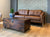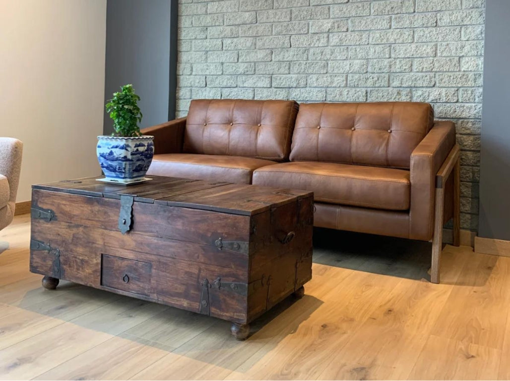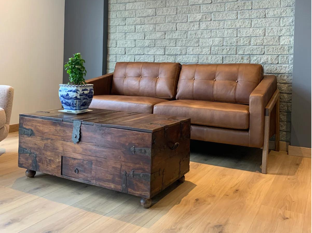 Handcrafted Oak & Brown Leather Three-Seat Sofa